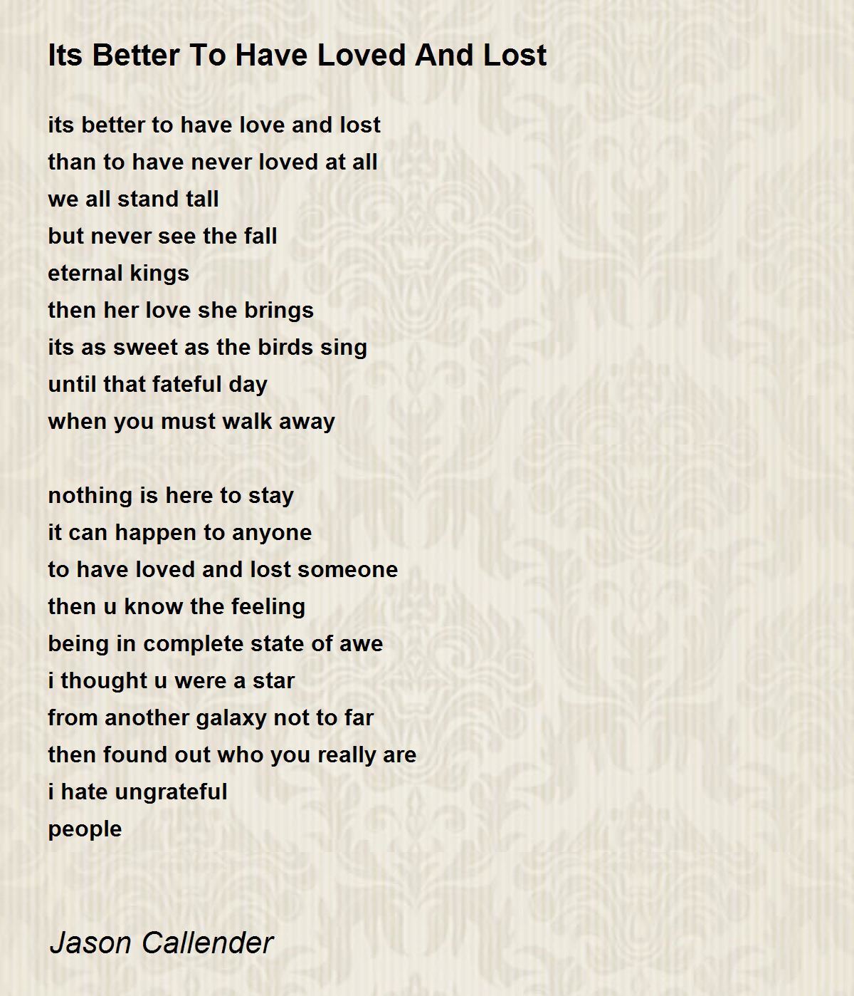 Better to have loved and lost poem. Viewed this way Tis better to have loved and lost Than never to have loved at all may as well stand in as a two-line abstract for the poem as a whole. Tis better to have loved and lost Than never to have loved at all. Time is too slow for those who wait too swift for those who fear too long for.