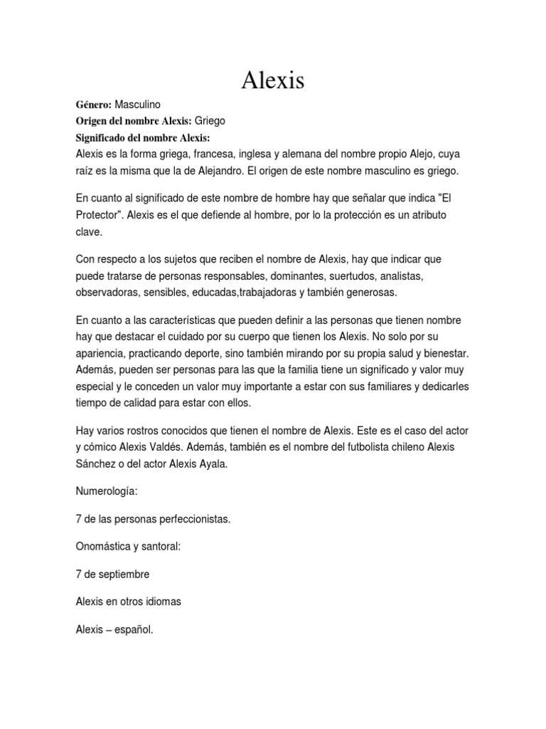Lo analiza todo antes de tomar una decisión. No dudes en consultar los comentarios de otras personas o compartir los suyos con nosotros aquí si tienes más información acerca de este nombre. Características personales del nombre Alexis. Es una variante del nombre Alejandro y cuyo significados tienen mucho que ver con la protección ya que puede ser El que protege o también El defensor del hombre. Forma latina equivalente a la castellana Alejo. Cómo son las personas de nombre Alexis. Defensor de los hombres ayudanteAlejandro Magno fue un rey macedonio del siglo IV por el que se nombra la ciudad egipcia de Alejandría.